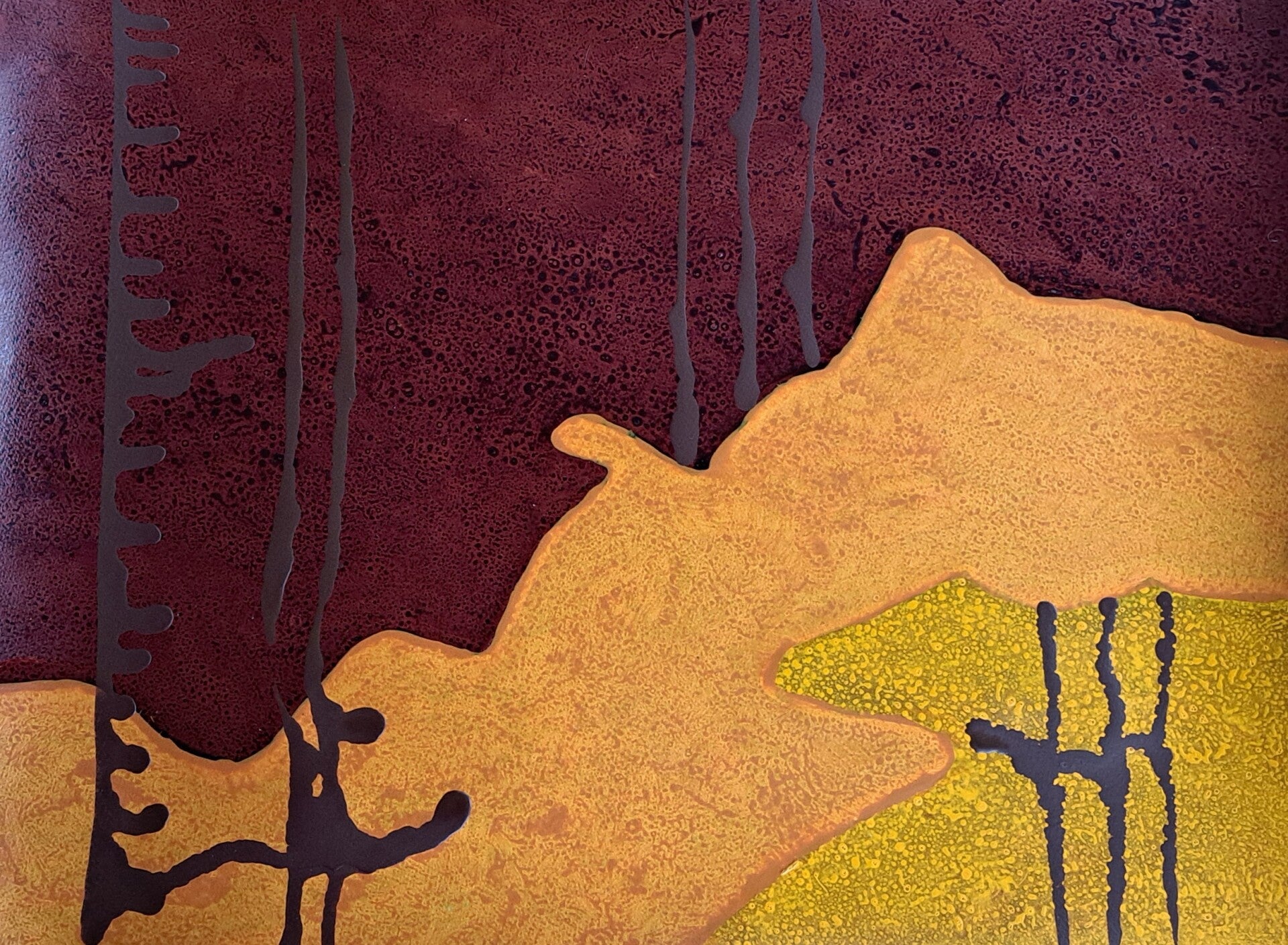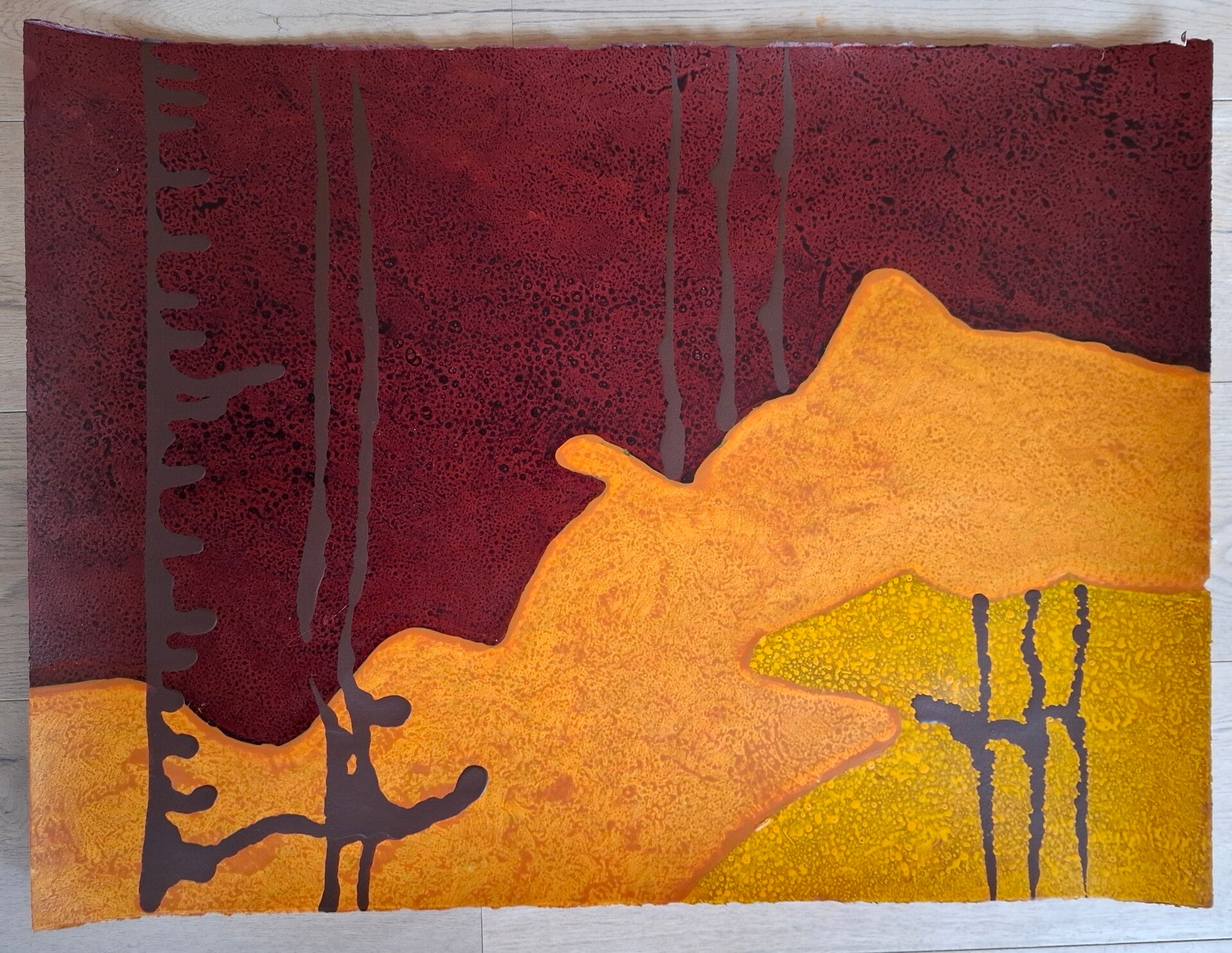 Achtergrond informatie: Het werk is geschilderd met vloeibare acryl - inkt (Golden high flow acrylics) laag op laag op laag op Saunders Waterford papier, 300 gram per vierkante meter, formaat een werk 56X76 cm.